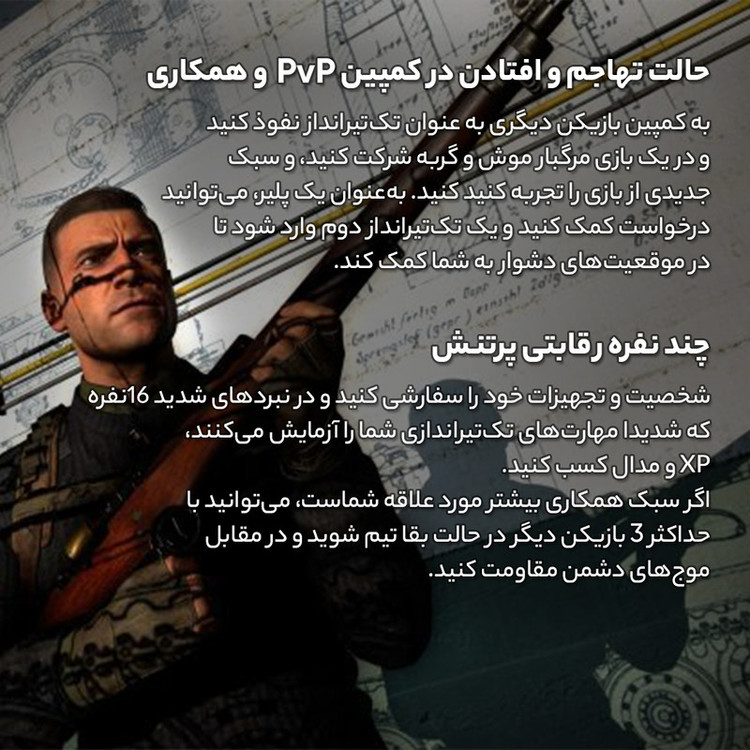 بازی Sniper Elite 5 جدیدترین بازی در سری Sniper Elite است که گیم پلی تک تیراندازی تاکتیکی سوم شخص این سری را به بهترین شکل ارائه میکند و kill cam های معروف این سری نیز بهتر از همیشه بازگشتهاند. بازی Sniper Elite 5 دارای مپهای متعدد برگرفته از مکانهای واقعی با جزئیات فوقالعاده بالا است و اکنون میتوانید به شکلهای بیشتری در محیط بگردید و از موانع مختلف عبور کنید. در بازی Sniper Elite 5 شما در نقش کارل فیربرن، تک تیرانداز خبره و مأمور ویژه رنجرهای مخفی ارتش آمریکا، در سال 1944 به فرانسه میروید و با کمک ارتش مقاومت فرانسه، باید از پروژه سری کراکن که به آلمانها کمک میکند تا قبل از رسیدن نیروهای آمریکایی، جنگ جهانی دوم را پیروز شوند، جلوگیری کنید. در بازی Sniper Elite 5 بسیاری از مکانهای واقعی جنگ جهانی دوم با فتوگرامتری در بازی با جزئیات فراوان شبیهسازی شدهاند تا نقشهها حس و حالی واقعی داشته باشند. شما راههای ورود و خروج زیادی در پیش رو دارید و میتوانید اهداف خود را به شکلهای متعدد از بین ببرید. بازی Sniper Elite 5 را به صورت آنلاین میتوانید با دوستان خود بازی کنید و در قالب یک تیم، مأموریتها را به پایان برسانید. در بازی Sniper Elite 5 میتوانید از زیپ لاین استفاده کنید، از شیبها سر بخورید یا از لبهها آویزان شوید تا به نقطه دید مورد نظر خود برسید. همچنین باید با استفاده از مخفی کاری از دید نگهبانان دشمن مخفی بمانید. علاوه بر جاذبه، جهت و سرعت باد و ضربان قلب، در این بازی باید هنگام تیراندازی تأثیر ویژگیهای سلاح خود مانند نوع قنداق و طول و جنس لوله تفنگ را نیز در نظر بگیرید. در بازی Sniper Elite 5 گزینههای زیادی برای تقویت و شخصیسازی سلاح خود دارید. در بازی با رجوع به میزهای کار مختلف، میتوانید نوع دوربین، قنداق، لوله و خشاب سلاح خود را تغییر دهید و تقریبا همه سلاحهای بازی قابل شخصیسازی هستند. همچنین شما به انواع گلولهها، از گلولههای ضدزره تا گلولههای مشقی دسترسی دارید. ویژگی آنلاین جدید بازی Sniper Elite 5 این است که شما میتوانید به صورت آنلاین، وارد بخش داستانی یک پلیر دیگر شوید و در نقش یک اسنایپر آلمانی، او را متوقف کنید. در نقش کارل نیز میتوانید برای مأموریتهای سخت، درخواست کمک کنید تا پلیرهای قویتر به شما کمک کنند.